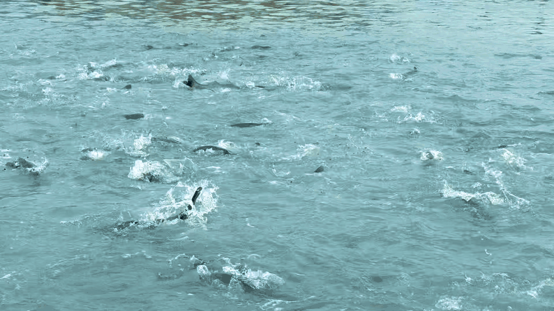 成百上千条大黄鱼同时破水而出,白色的鱼身翻腾,尾巴猛地一甩,激起一片白色浪花。它们前赴后继,争抢着每一粒饲料。